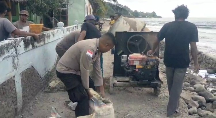 Aparat kepolisian dan warga bahu-membahu melaksanakan kegiatan gotong royong memperbaiki ruas jalan yang rusak akibat abrasi laut di Dusun Uwa, Desa Maluriwu, Kecamatan Palue, Kabupaten Sikka, Jumat (13/3/2026).