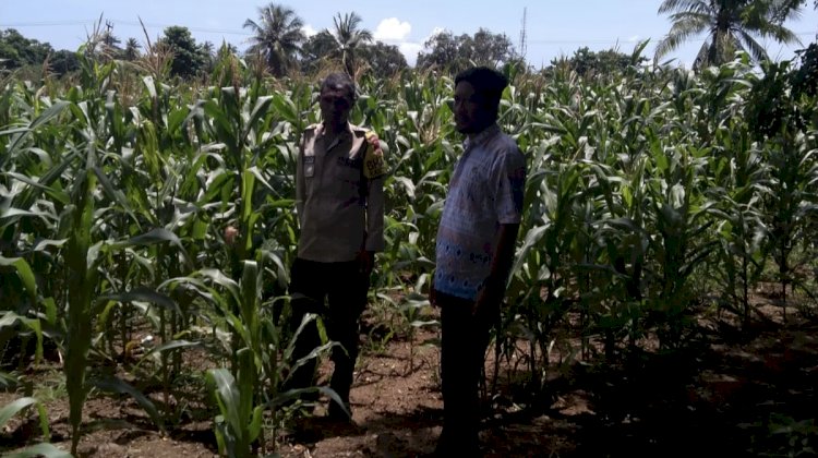 Dalam kegiatan tersebut, AIPDA Hironimus Taji Werang meninjau langsung perkembangan tanaman jagung yang telah ditanam oleh kelompok tani setempat sejak bulan Januari 2026.