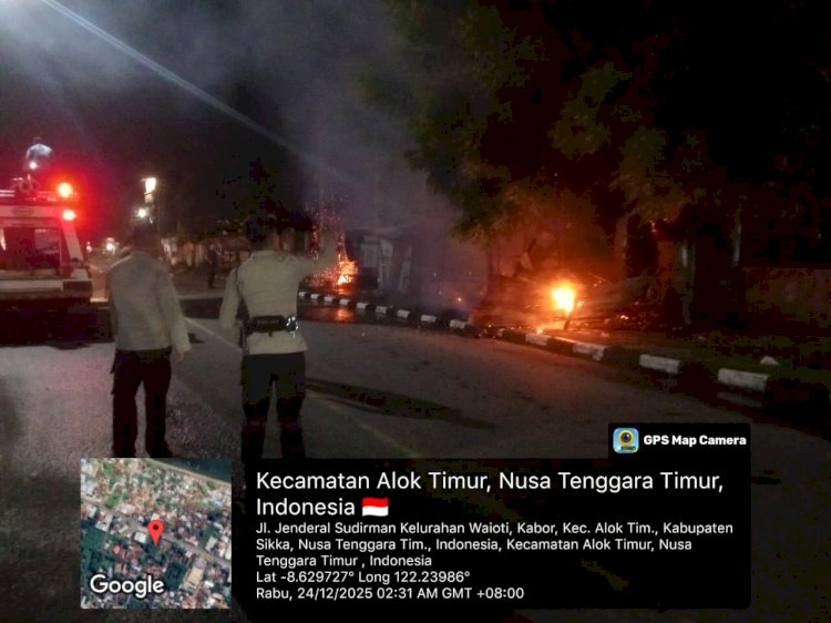 Tribratanewssikka.com - Maumere, 24 Desember 2025 – Peristiwa kebakaran hebat menghanguskan empat unit tempat usaha milik warga di Jalan Jenderal Sudirman, Kelurahan Waioti, Kecamatan Alok Timur, Kabupaten Sikka, pada Rabu (24/12/2025) dini hari.