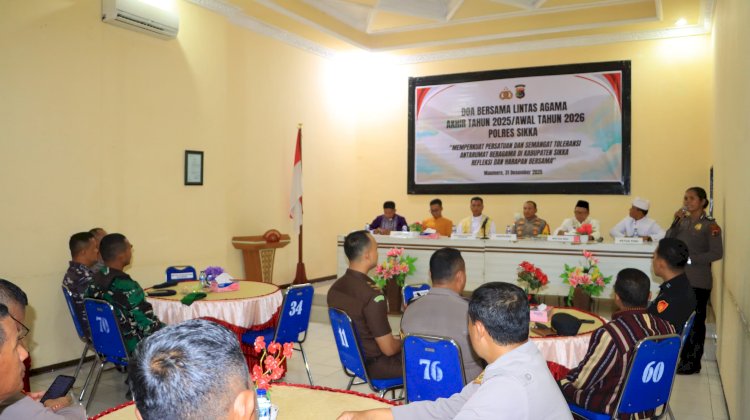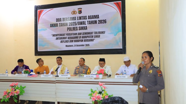 Tribratanewssikka.com - Maumere, 31 Desember 2025 – Di tengah keberagaman suku, agama, dan budaya yang menjadi kekayaan Kabupaten Sikka, Polres Sikka kembali menegaskan perannya sebagai penjaga persatuan dan perekat kebhinekaan melalui pelaksanaan Doa Bersama Lintas Agama Akhir Tahun 2025 / Awal Tahun 2026.