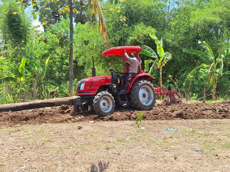 Kapolsek Kewapante Iptu Chairil Syafar, didampingi Kanit Binmas Aipda Yoseph Puri Koles dan Bhabinkamtibmas Desa Langir Bripka Yohanes Rinaldo Luga, turun langsung ke lapangan untuk mendampingi proses pembajakan lahan kelompok tani Suka Maju 1 seluas 5 hektare.