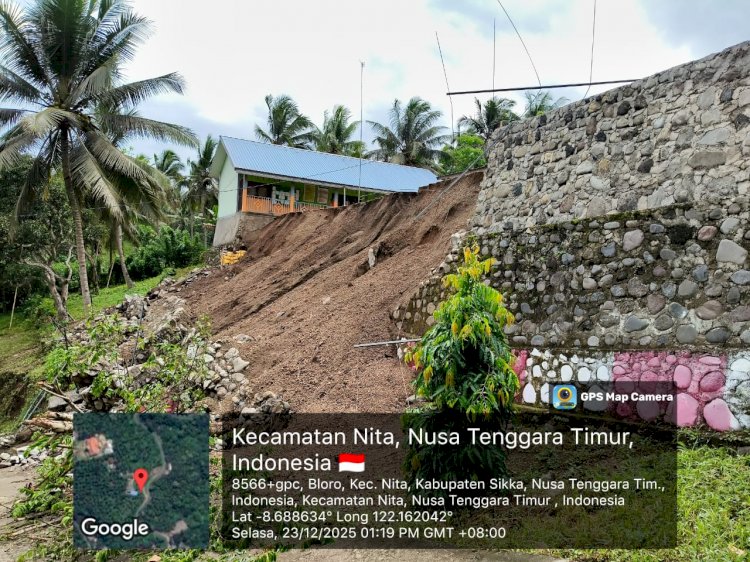 Tribratanewssikka.com - Maumere, 24 Desember 2025 — Curah hujan tinggi yang mengguyur wilayah Kecamatan Nita, Kabupaten Sikka, menyebabkan turap/tanggul pengaman halaman SMP Katolik Santissimatrinitas Bloro mengalami longsor. Peristiwa tersebut terjadi pada Minggu malam, 21 Desember 2025, sekitar pukul 19.00 WITA, di Dusun Key, Desa Lusitada.
