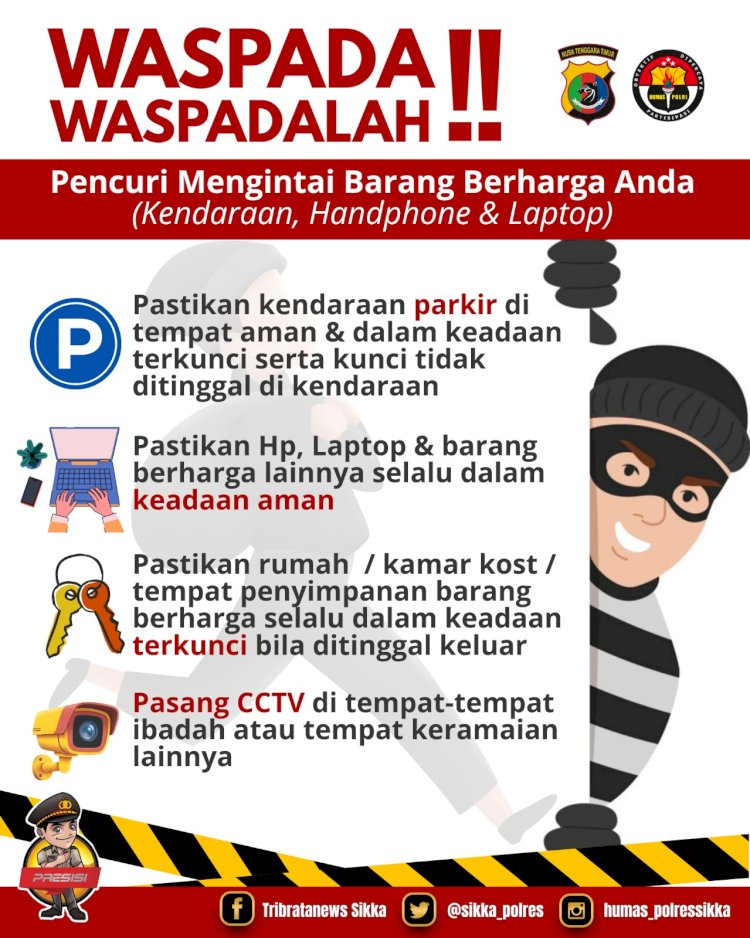 Dalam himbauan terpisah, Polres Sikka juga mengingatkan masyarakat agar lebih waspada terhadap aksi pencurian yang kerap mengincar barang-barang berharga seperti kendaraan bermotor, handphone, dan laptop. Masyarakat diminta untuk memastikan kendaraan diparkir di tempat yang aman, dalam keadaan terkunci, serta tidak meninggalkan kunci di kendaraan.