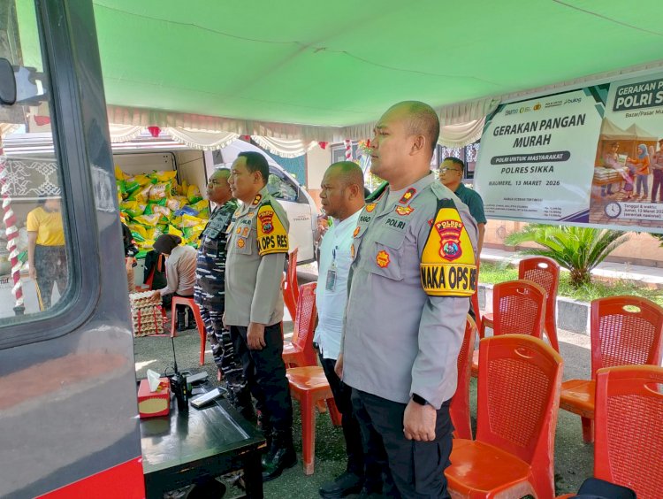 Tribratanewssikka.com - Maumere, 13 Maret 2026 — Dalam upaya membantu masyarakat memenuhi kebutuhan pokok dengan harga terjangkau sekaligus menjaga stabilitas harga pangan, Polres Sikka menggelar Bazar atau Pasar Murah Polri dalam rangka Gerakan Pangan Murah Polri Serentak, Jumat (13/3/2026).