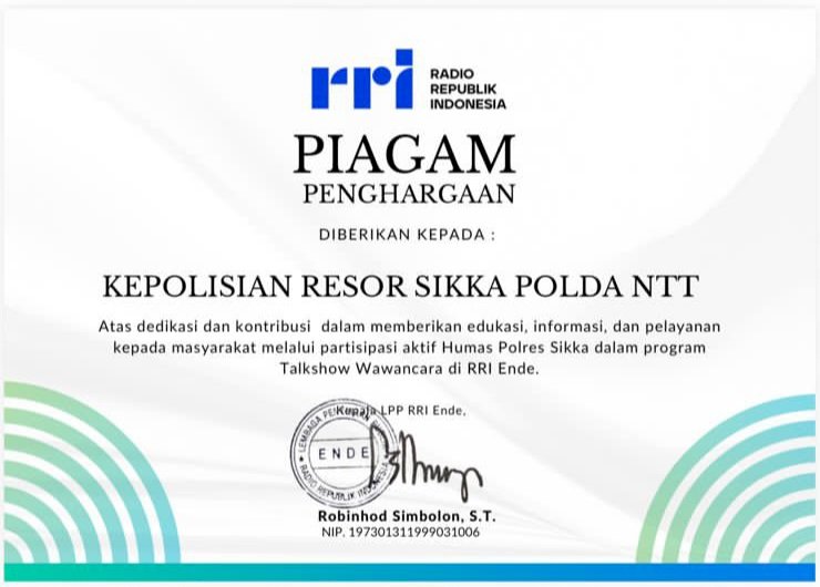 Sikka,NTT -Polres Sikka kembali menorehkan prestasi membanggakan. Kali ini, penghargaan diberikan oleh Pihak RRI Pro 1 Ende sebagai bentuk apresiasi atas dedikasi dan kontribusi aktif Polres Sikka dalam memberikan edukasi, informasi, dan pelayanan kepada masyarakat melalui program talkshow wawancara yang rutin diselenggarakan oleh RRI.