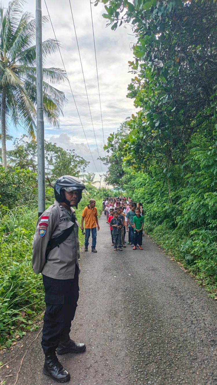 Sejak pukul 17.00 Wita, personel Polsek Lela telah bersiaga di sepanjang jalan umum Desa Lela, Kecamatan Lela, Kabupaten Sikka, guna mengawal dan mengamankan prosesi Kirab Salib NYD OMK Stasi Lela.