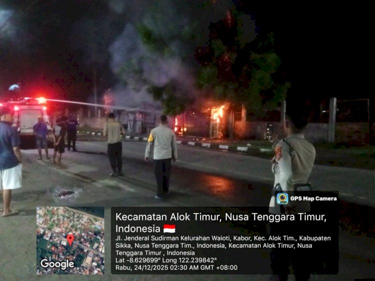 Tribratanewssikka.com - Maumere, 24 Desember 2025 – Peristiwa kebakaran hebat menghanguskan empat unit tempat usaha milik warga di Jalan Jenderal Sudirman, Kelurahan Waioti, Kecamatan Alok Timur, Kabupaten Sikka, pada Rabu (24/12/2025) dini hari.