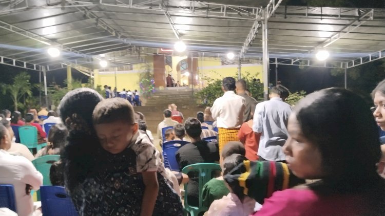 Tribratanewssikka.com - Maumere, 24 Desember 2025 — Perayaan Misa Malam Natal di Kapela Santo Antonius Padua Napunglangir, Kelurahan Wolomarang, Kecamatan Alok Barat, Kabupaten Sikka, berlangsung dengan penuh khidmat, agung, dan meriah pada Rabu malam, 24 Desember 2025. Suasana sakral dan penuh sukacita menyelimuti perayaan Natal yang dihadiri umat Katolik dari seluruh lingkungan Stasi Napunglangir.